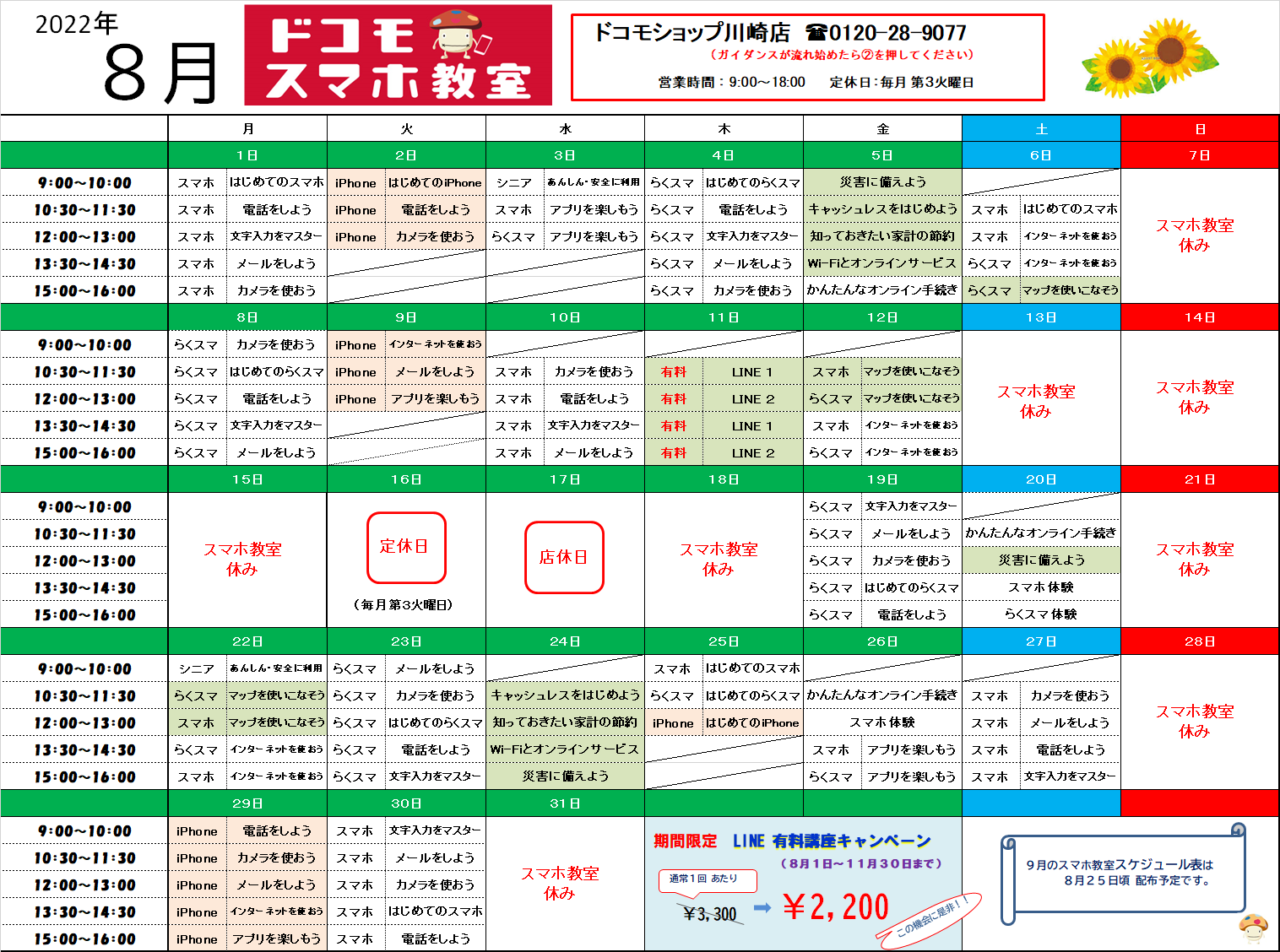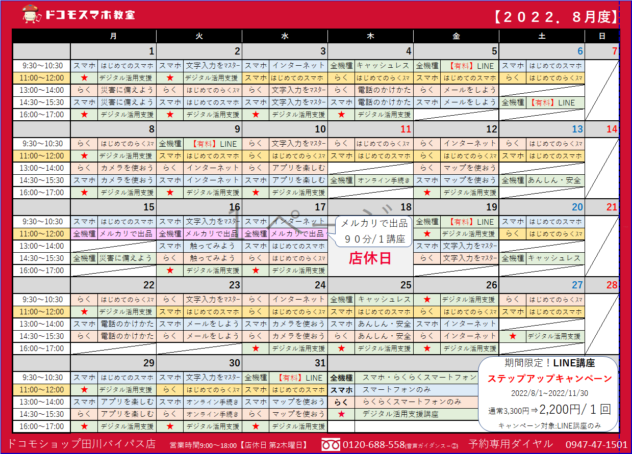 8月のスマホ教室スケジュール(ドコモショップ伊田店)