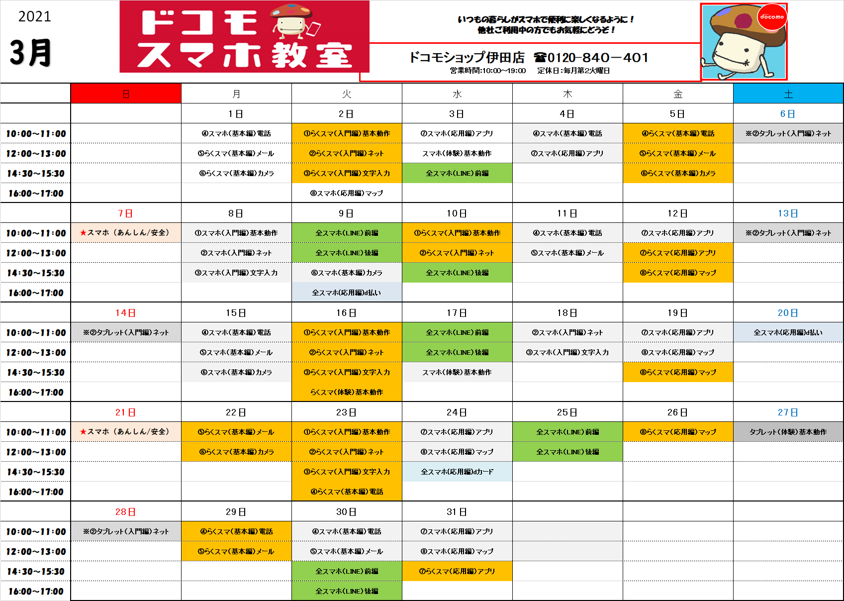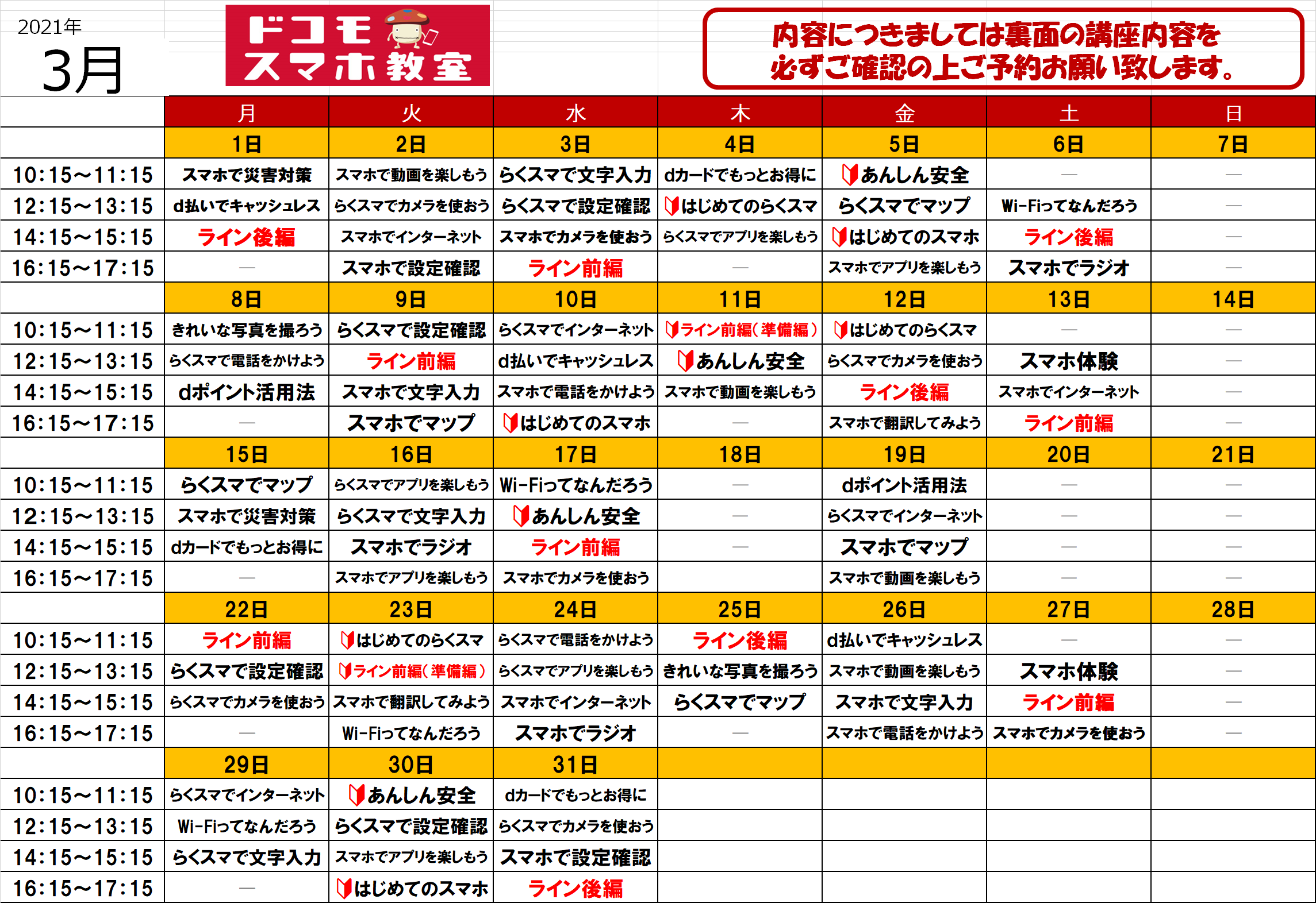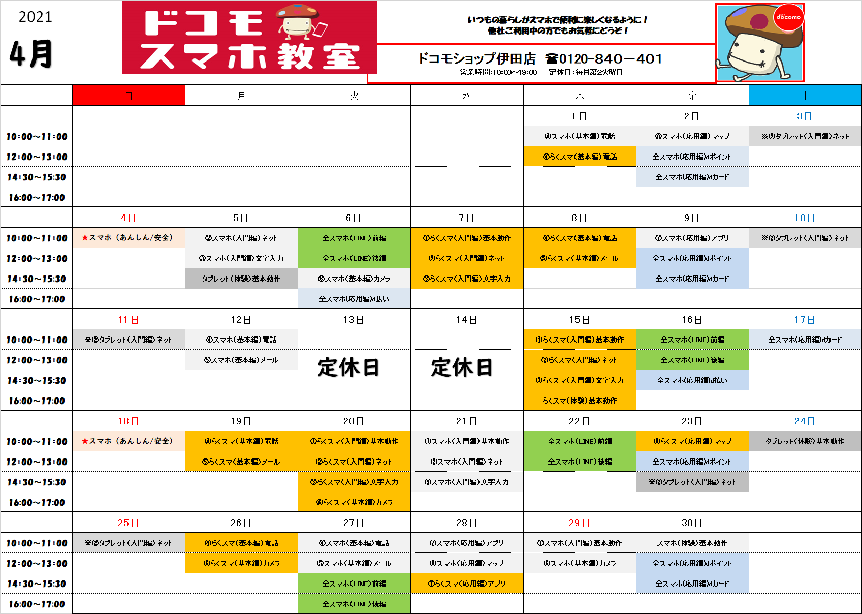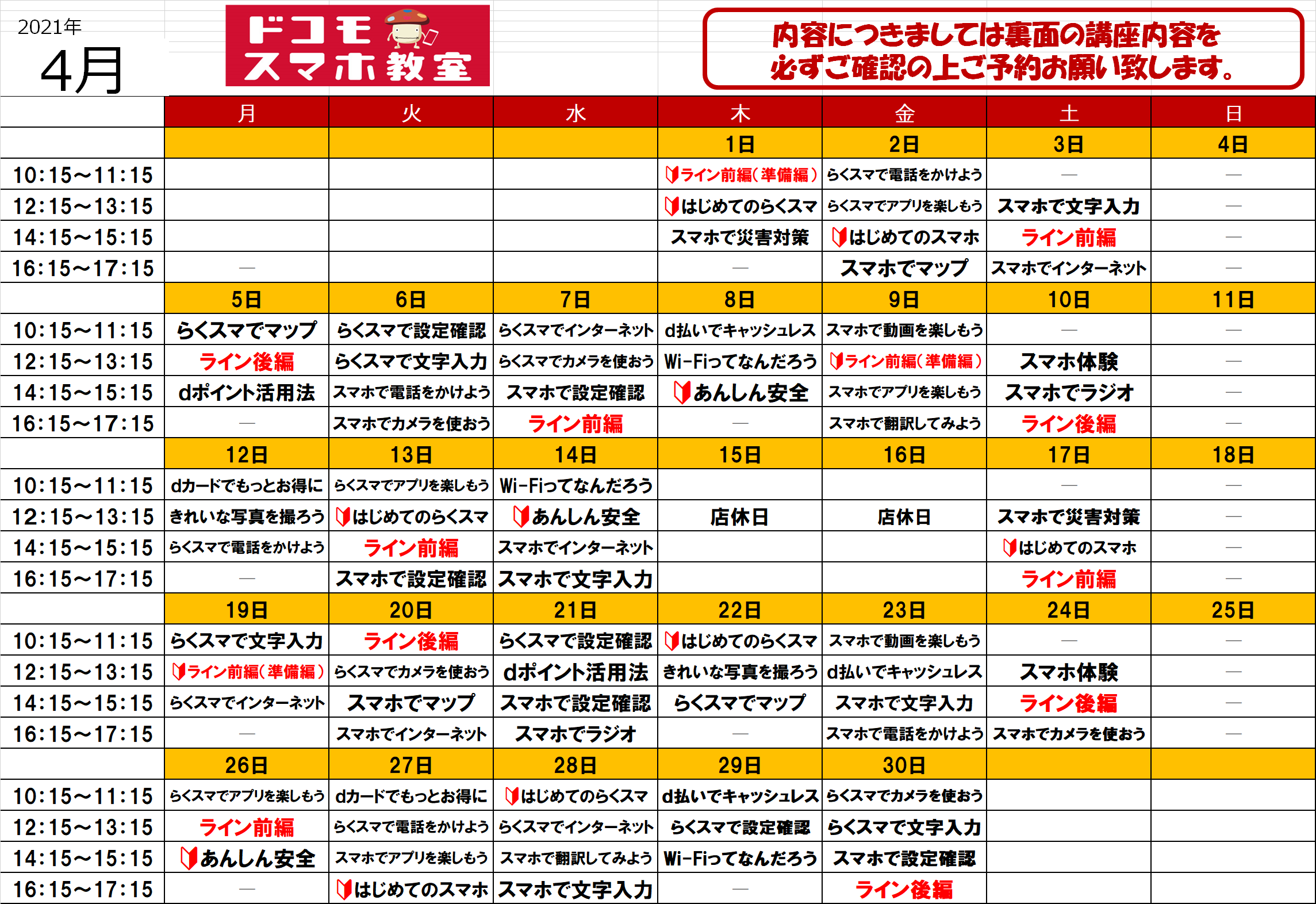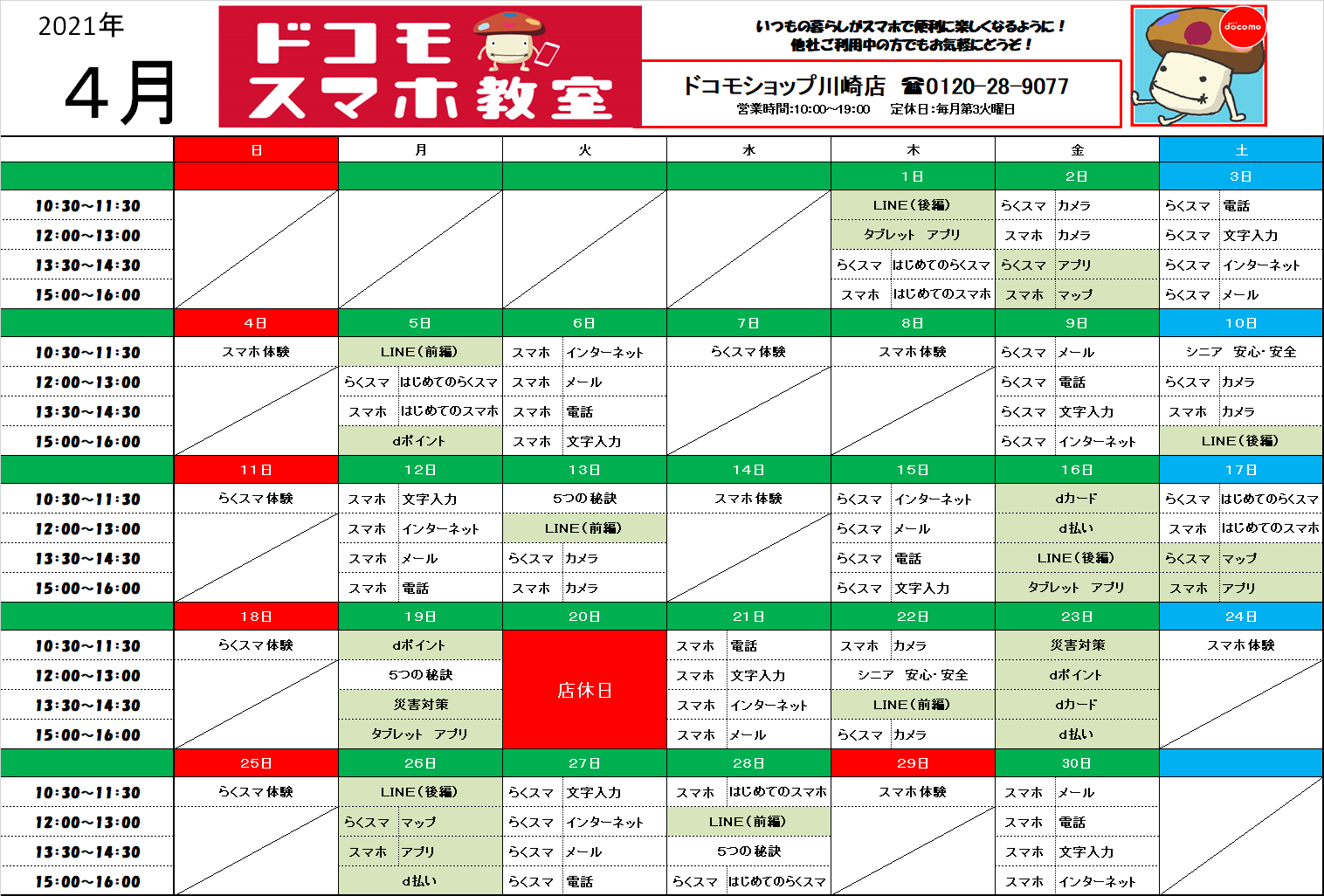 4月のスマホ教室スケジュール(ドコモショップ川崎店)