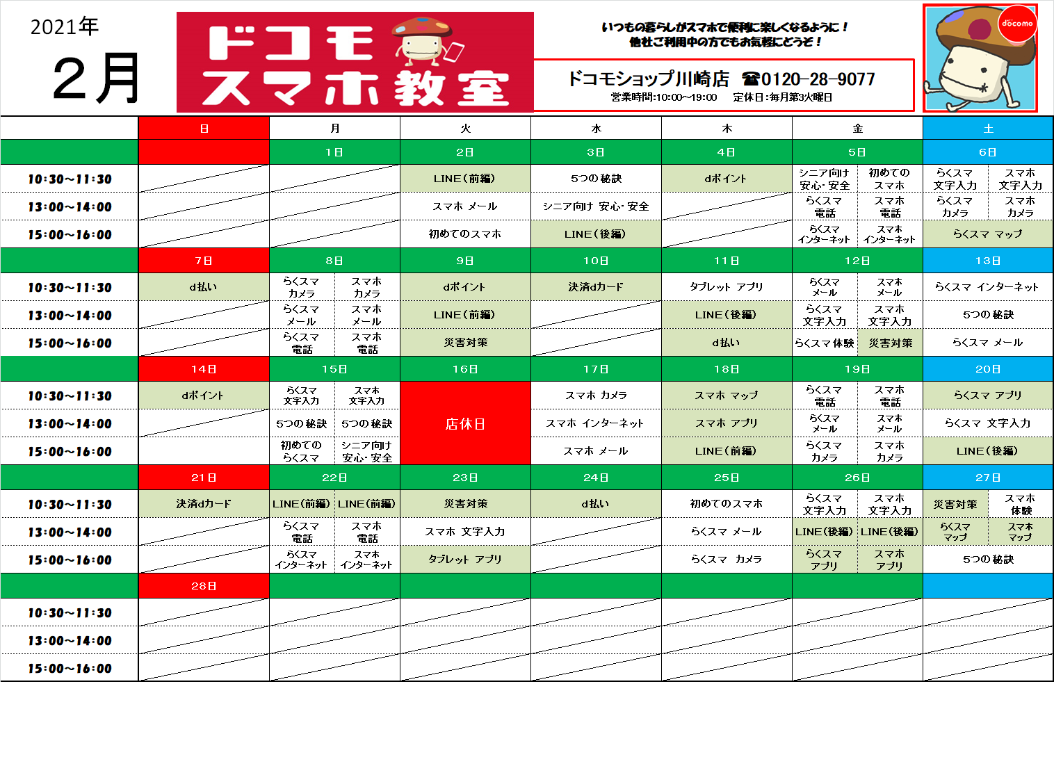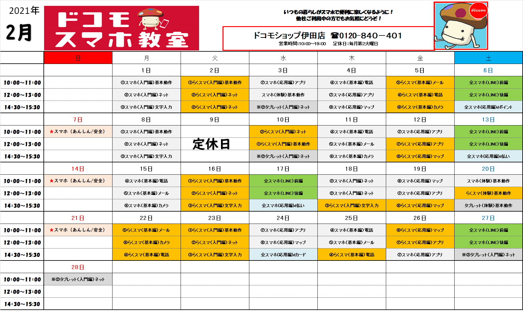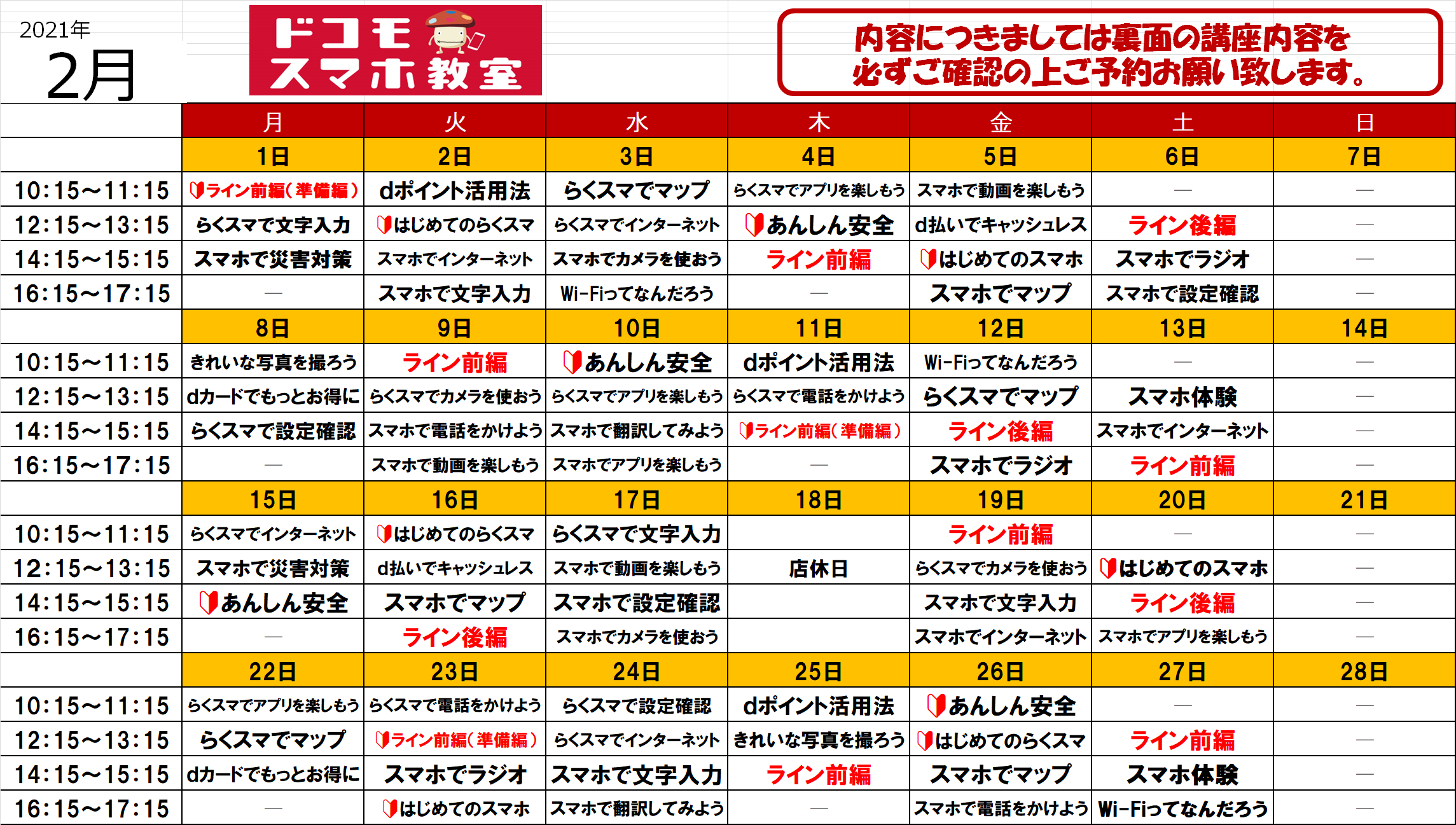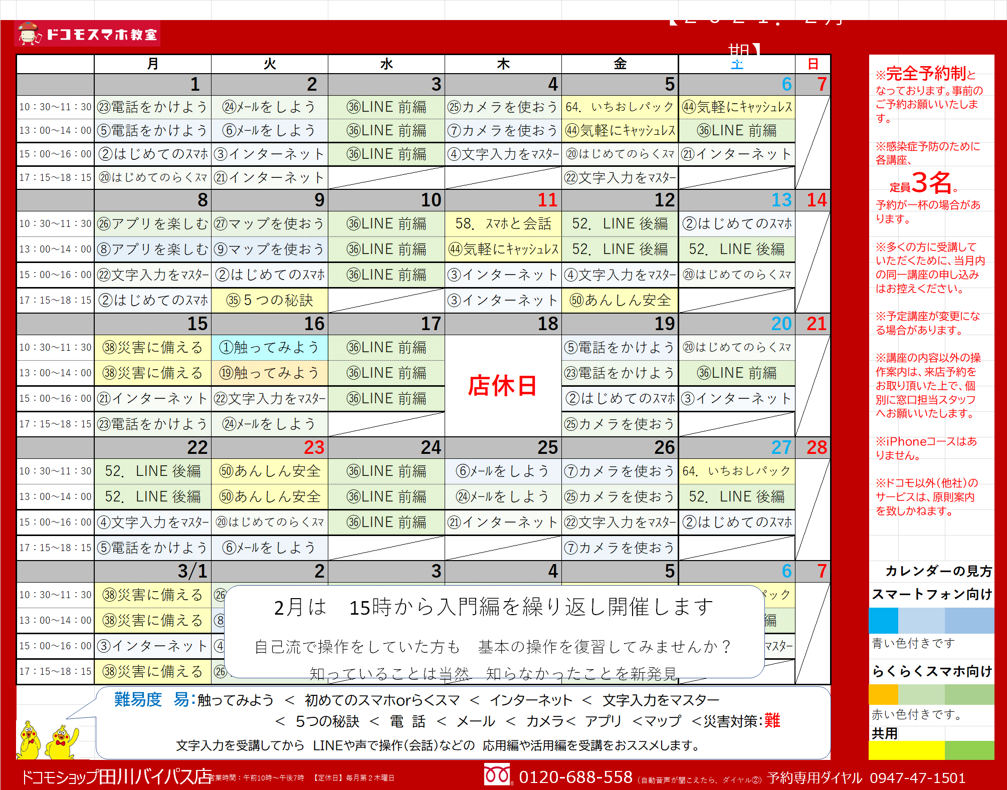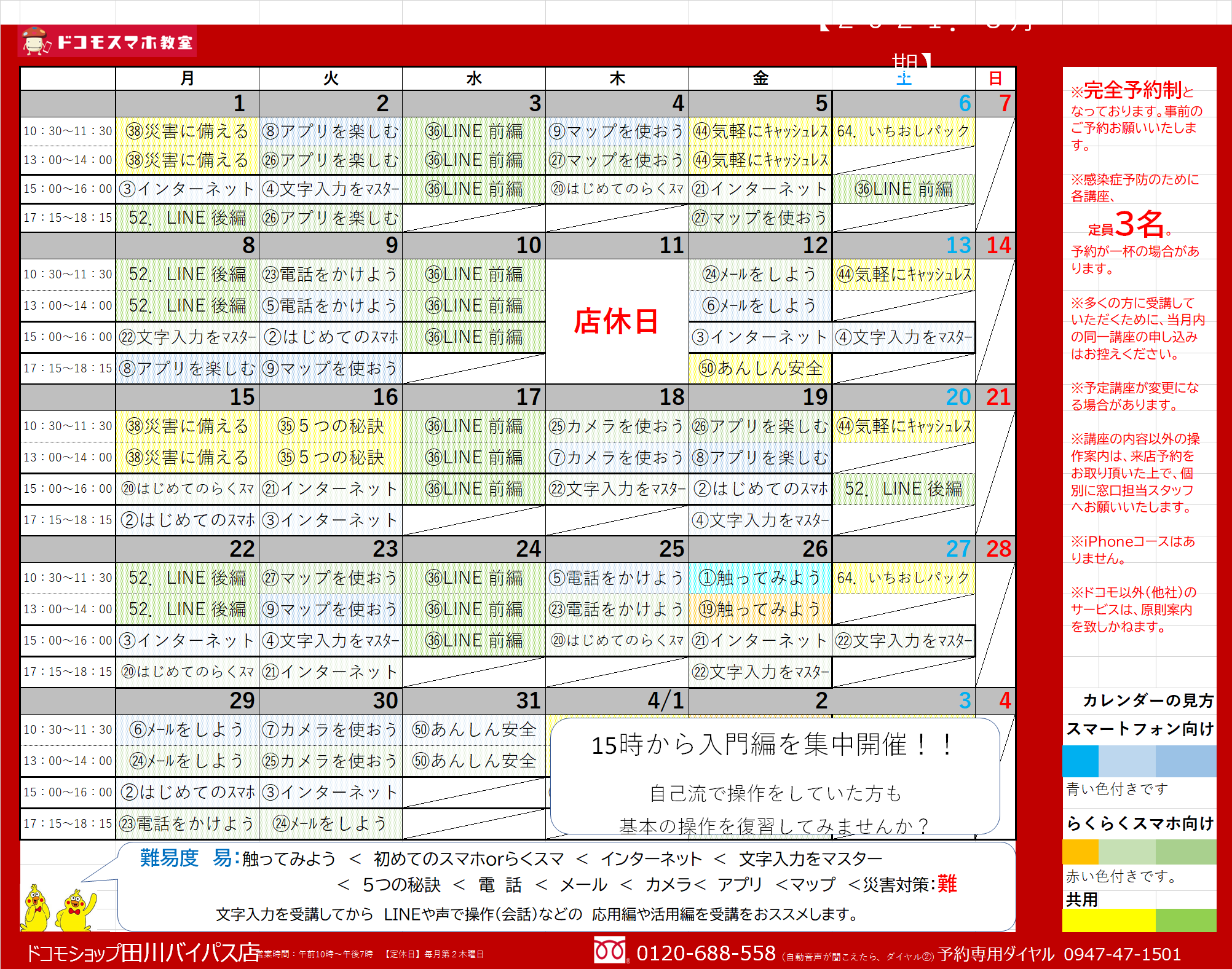 3月のスマホ教室スケジュール(ドコモショップ田川バイパス店)
