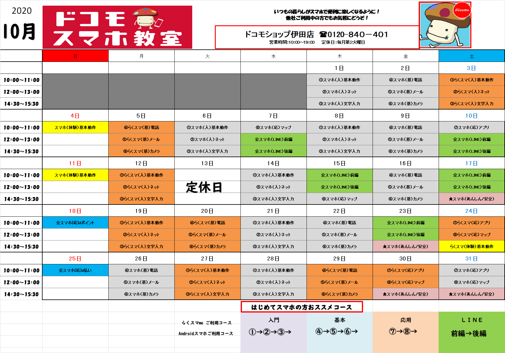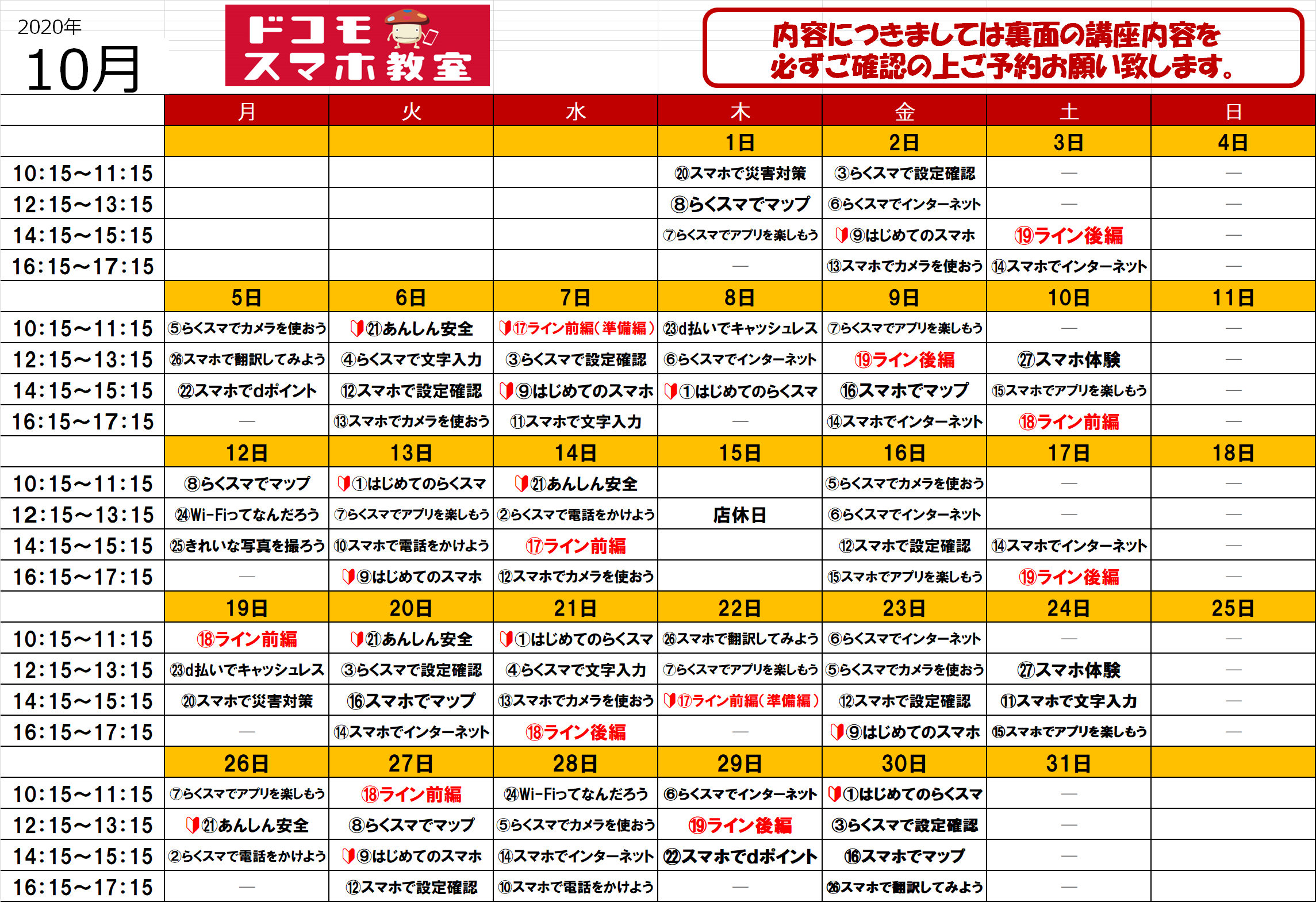 10月のスマホ教室スケジュール(ドコモショップ伊田店) 2020-10-03 ドコモショップ伊田店ではスマホ教室を開催しています。 もうスマホの方も、まだどうしようと迷われている方もどなたでも参加できるスマホ教室です。 様々な講座を準備して皆様のご来店をお待ちしております。 各講座人数制限がございますので、お早めに予約の上ご来店ください。 一度受けた講座でも何度でも受講可能です。 皆様のご来店を心よりお待ちしております。