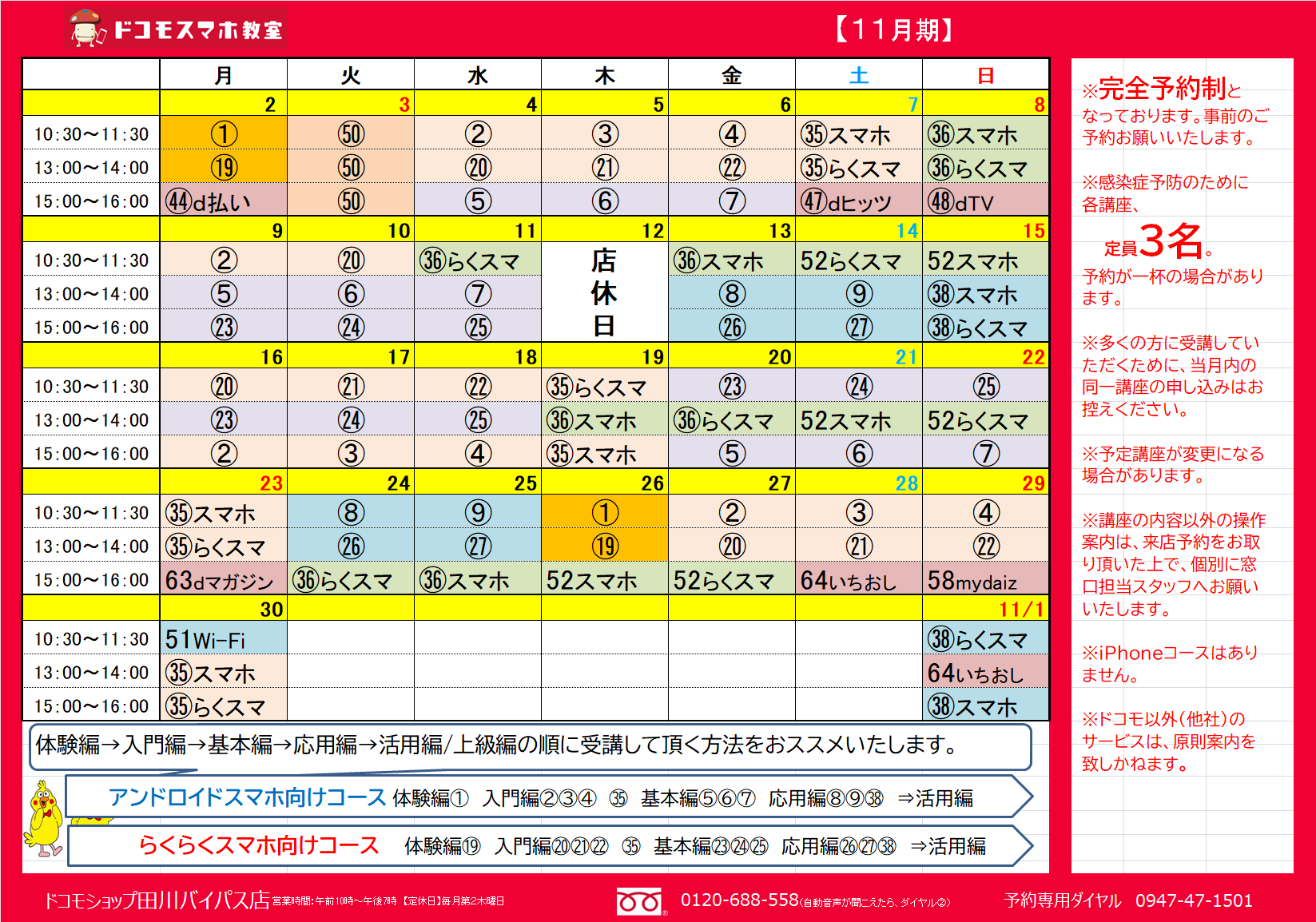 11月のスマホ教室スケジュール(ドコモショップ田川バイパス店) 2020-11-01 ドコモショップ田川バイパス店ではスマホ教室を開催しています。 もうスマホの方も、まだどうしようと迷われている方もどなたでも参加できるスマホ教室です。 様々な講座を準備して皆様のご来店をお待ちしております。 各講座人数制限がございますので、お早めに予約の上ご来店ください。 一度受けた講座でも何度でも受講可能です。 皆様のご来店を心よりお待ちしております。